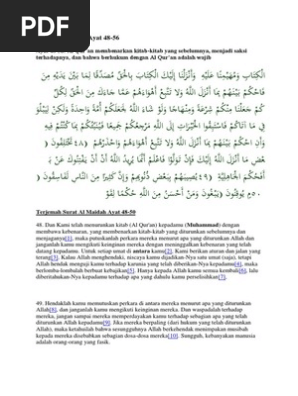 Poin kedua dari surat al maidah ayat 48, allah subhanahu wa ta'ala memerintahkan berpegang kepada al quran. Ayat ini menjelaskan bahwa allah telah menurunkan al quran kepada nabi muhammad shallallahu 'alaihi wasallam dengan membawa kebenaran dan tiada keraguan di dalamnya. Kelompok 3 fahri ahmad fachrudin kresna alif tiantoro tajwid muhamad aldi ramdhan rizky dwi saputra isi kandungan 1. Tolong untuk membagikan artikel ini ke berbagai sosial media agar lebih banyak lagi yang membaca al quran, dan anda pun tentu saja akan mendapat amal karena telah mengajak orang lain untuk membaca al quran. Demikian surat al maidah ayat 48 mulai dari tulisan arab dan latin, terjemah dalam bahasa indonesia, tafsir dan isi kandungan maknanya.