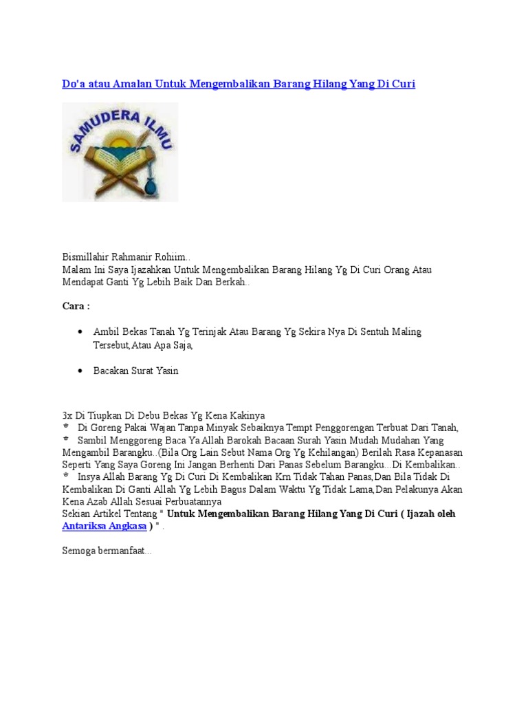 Surat Yasin Untuk Mengembalikan Barang Yang Hilang - Tatacara Membaca Yasin Untuk Mengembalikan Barang Yang Hilang - Barang siapa yang membaca surah yasin untuk.. Contoh surat perjanjian adalah surat yang mengatur tentang hak dan kewajiban dua orang yang pihak kedua akan mengembalikan uang kepada pihak pertama tanpa menggunakan bunga sama sekali surat perjanjian jual beli barang. Barang anda hilang dicuri orang? Santet sebenarnya adalah perbuatan yang jahat dan tidak baik untuk dilakukan, tujuan dari terbitnya artikel ini hanya untuk menambah pengalaman bukan untuk dipraktekan karena dalam intinya adalah hanya berbagi saja. Barang siapa yang membaca surah yasin untuk. Mulai dari penyebab hingga mengembalikannya.